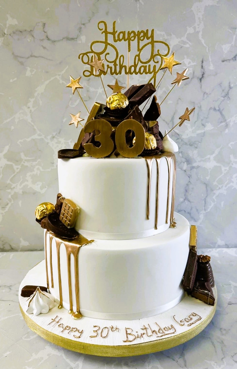 2 tier drip birthday cake with a selection of chocolates 6-8'' cakes start at €320 chocolate biscuit €30 extra per layer