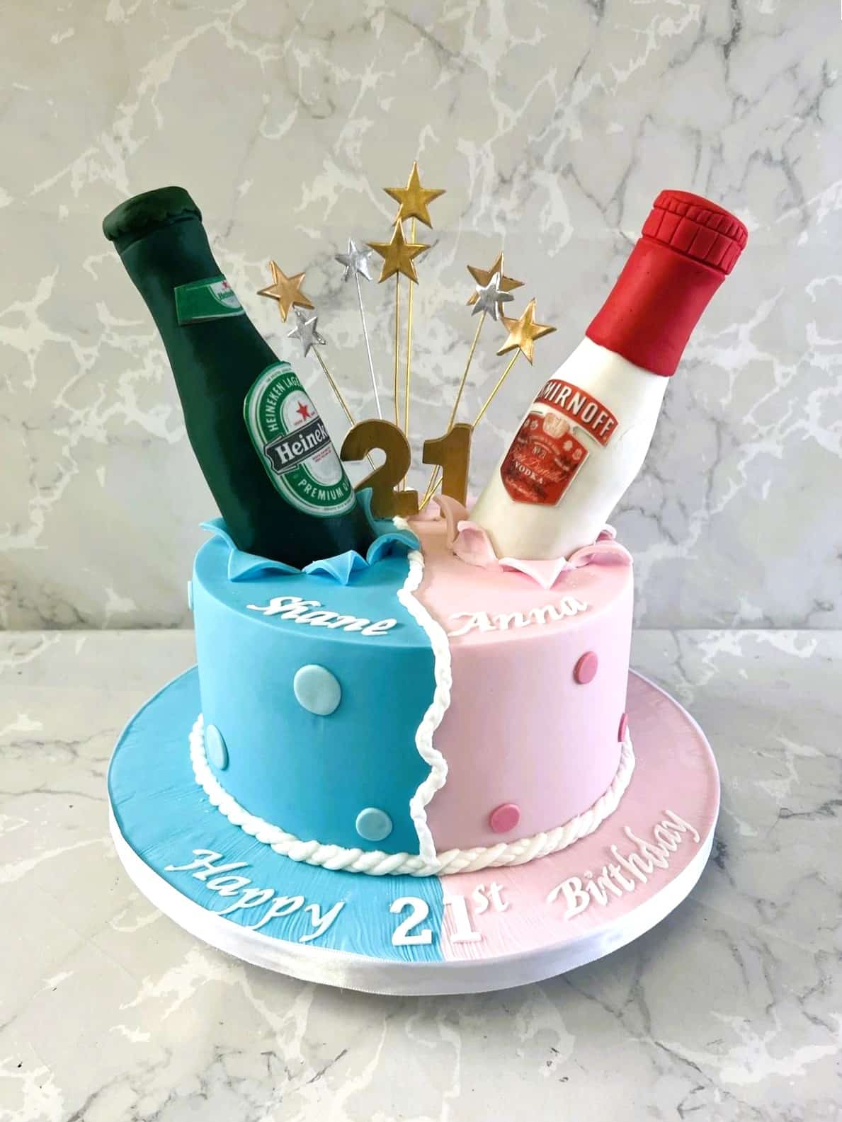 Twins birthday cake with chocolate booze bottles made of chocolate 8'' starts at €250 chocolate biscuit €30 extra