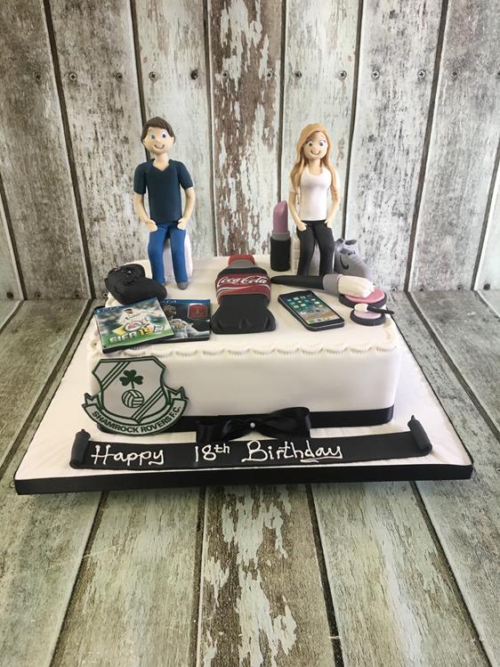 split design birthday cake with 2 sugar figure 10x8" cake €290 chocolate biscuit €30 extra