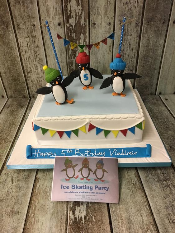 Skating Penguins birthday cake 8''" €290 biscuit €30 extra