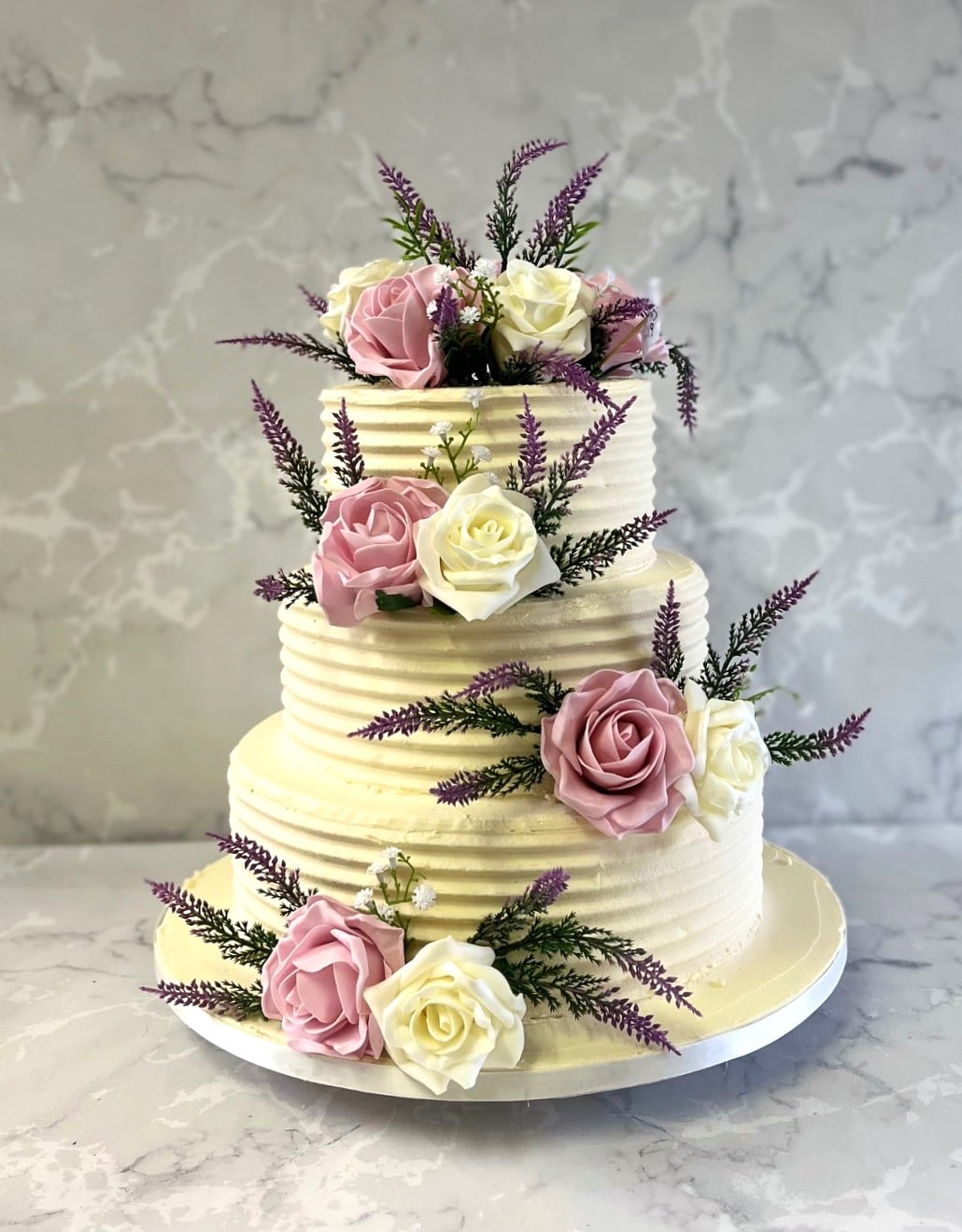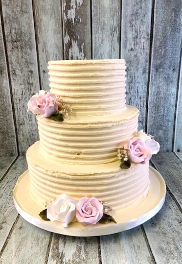 Combed buttercream wedding cake with handmade sugar roses 6-8-10'' cakes start at €590