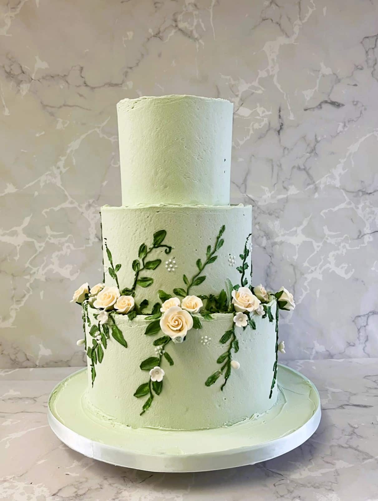 Pale Green buttercream wedding cake with guar roses and buttercream leaf's 5-7-9'' cakes €870