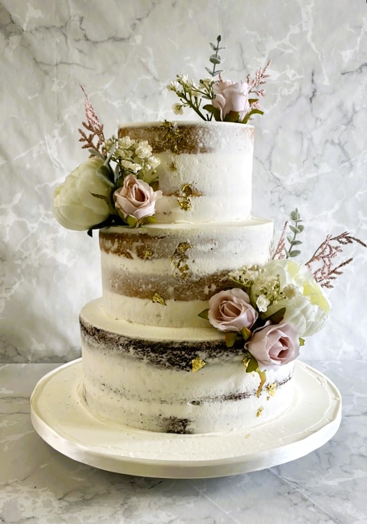 3 tier semi naked wedding cake with silk flowers and gold leaf 6-8-10'' €650