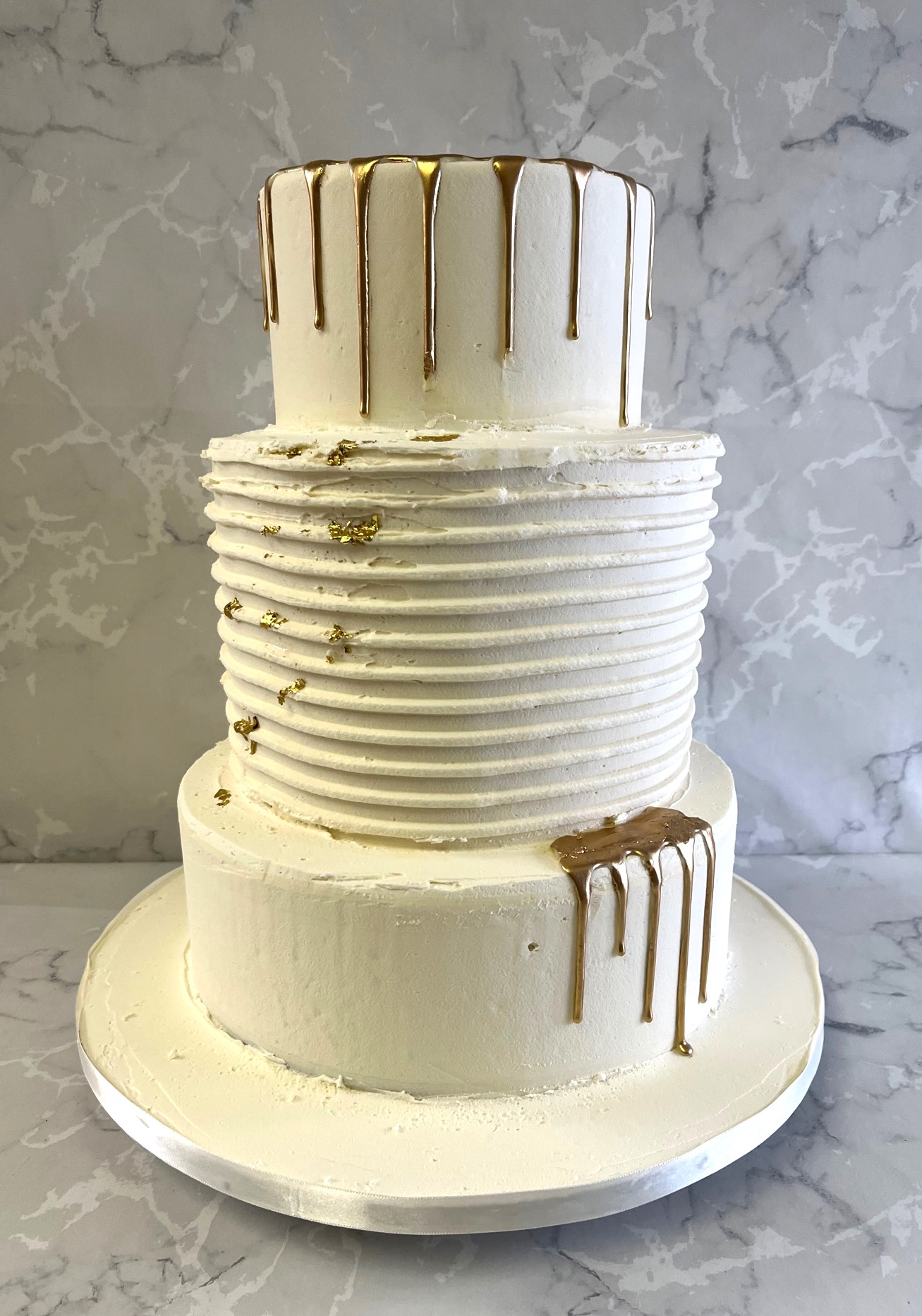 combed buttercream wedding cake with gold drip and gold leaf 6-8-8-10'' cakes €690