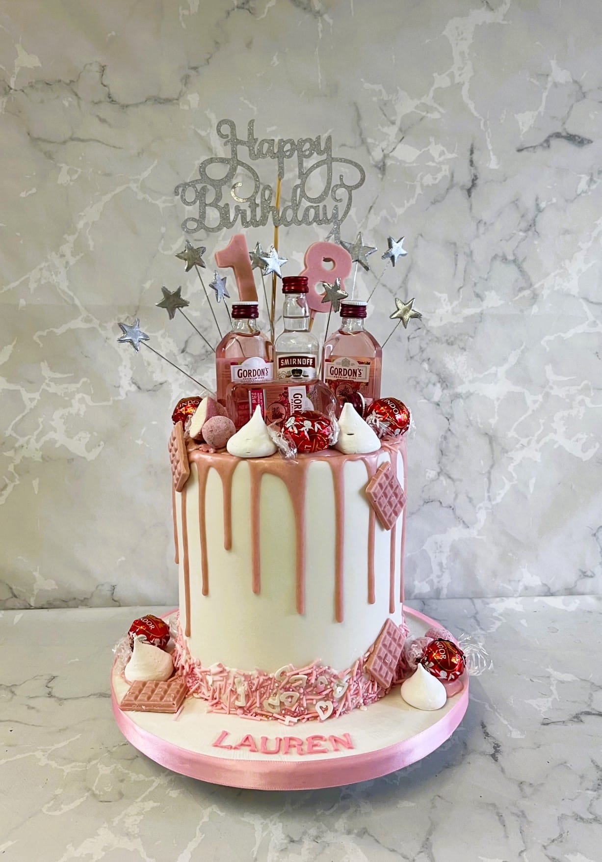 Drip style birthday cake with mini pink gin bottles 2x6'' starts at €320 chocolate biscuit €30 extra per layer