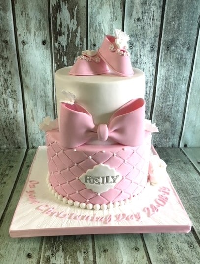 Quilted bow and booties christening cake 6-8'' cakes €290 Biscuit €30 extra per layer