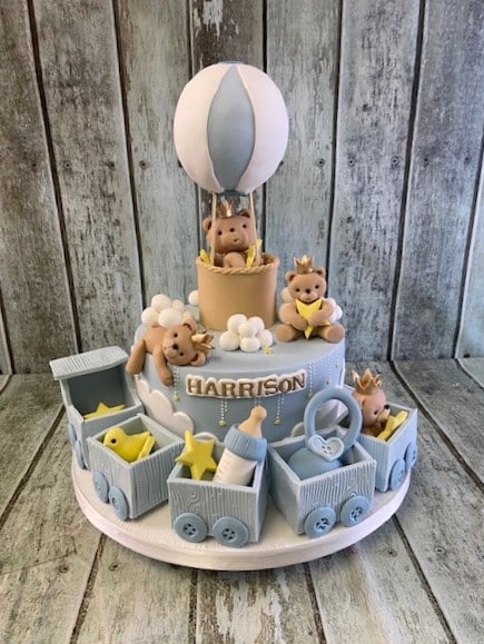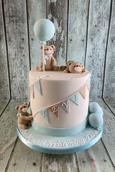 Bears and balloons high christening cake 2x7'' cakes €270 Biscuit €30 extra per layer