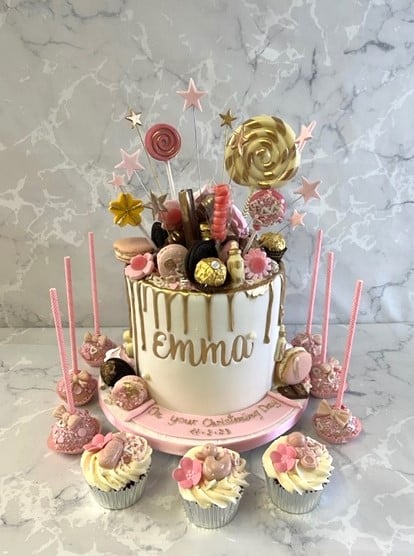 Drip christening cake 2x7'' cakes 6 cup cakes 6 cake pops €350 chocolate biscuit €30 extra per layer
