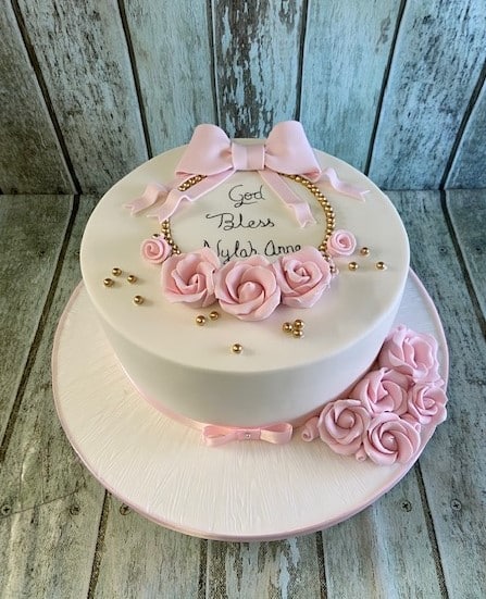 Christening cake 8'' sponge €220 chocolate biscuit €30 extra