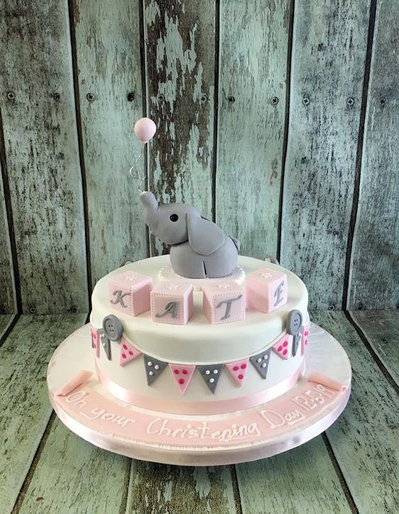 Christening cake with elephant and bunting 8" sort cake starts at €190 chocolate biscuit is €30 extra