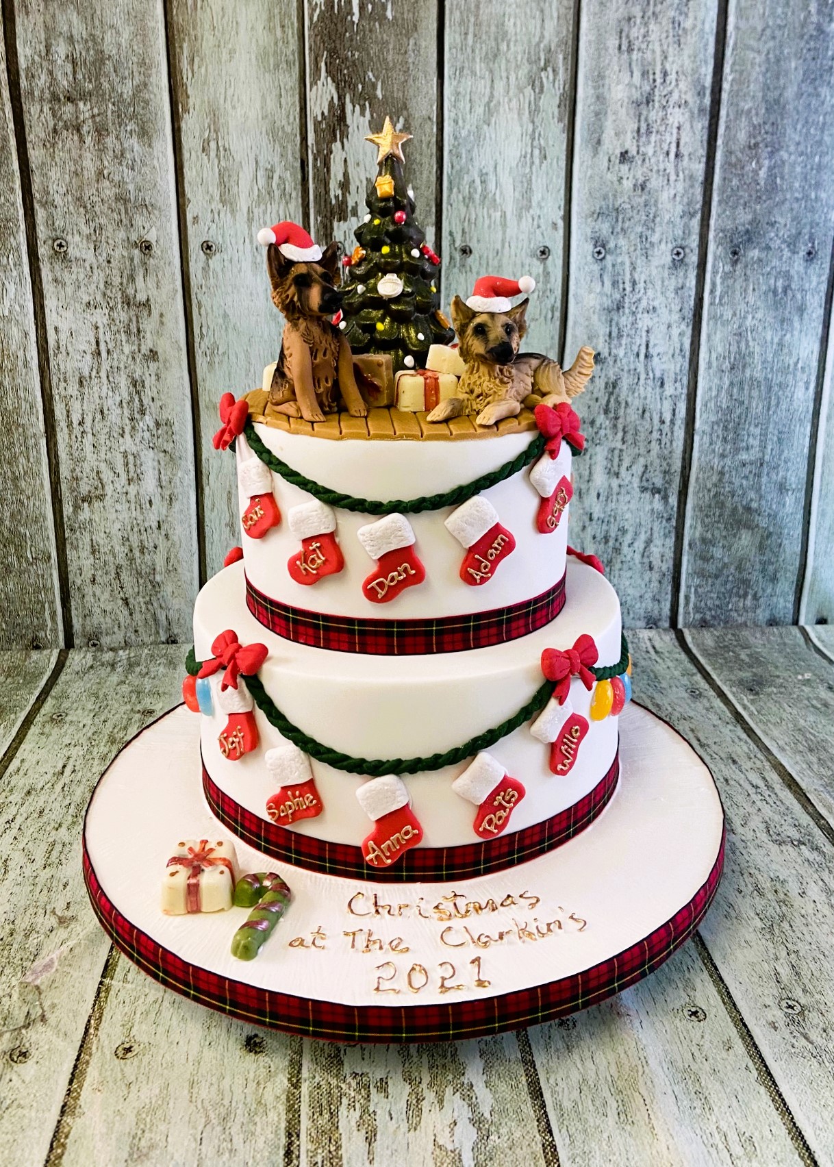 Christmas-cake-with-family-stockings- Christmas family cake 6-8\'\' stars at €320 chocolate biscuit €30 extra per layer