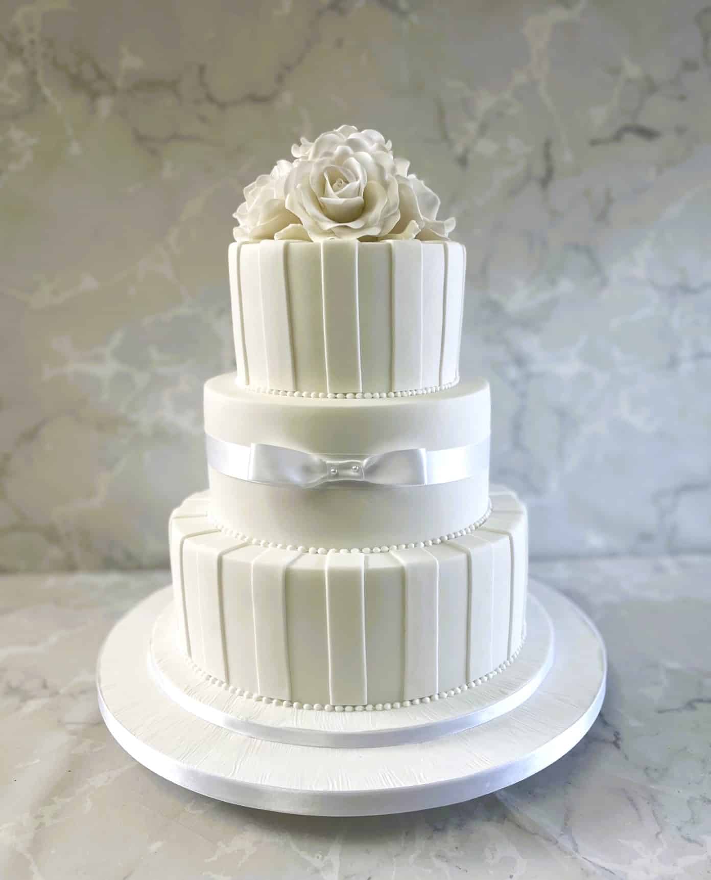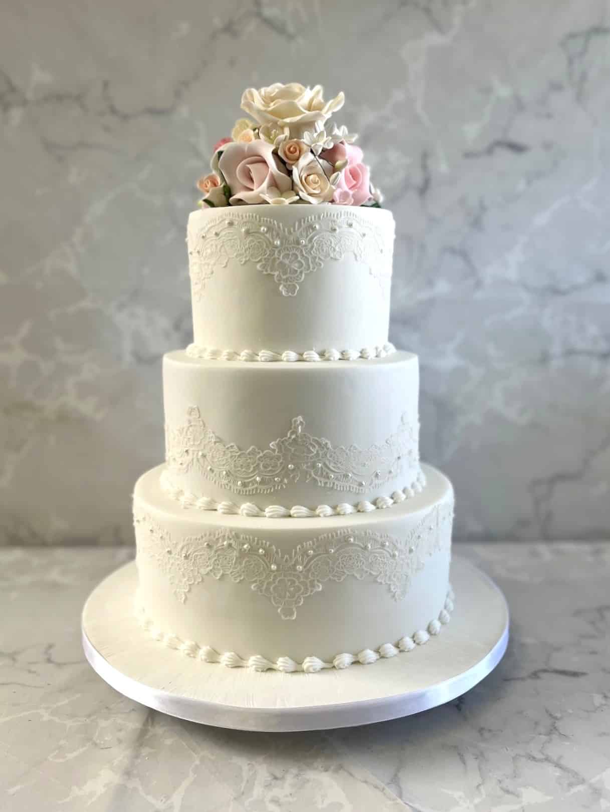 Hand cut icing stripes topped of with delicate roses wedding cake
