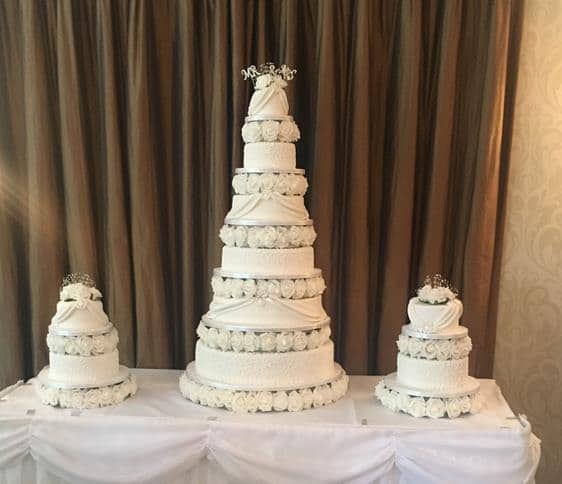 extra large wedding cake and two side cakes all matching separated with sugar flowers and ice in detail to finish it off in colours of your choice