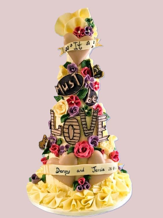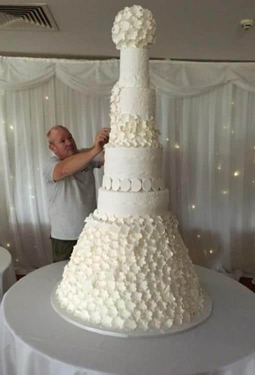 Extra large wedding cake with swags of flowers made of sugar half moons to have an unusual look and hand piped pearl To finish it off