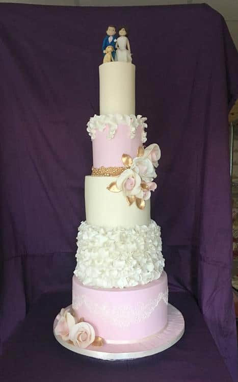 Extra large pink and ivory wedding cake with hand painted gold and added ruffles with large handmade sugar roses and a cake topper made of shore also and to add a find of touch some demask