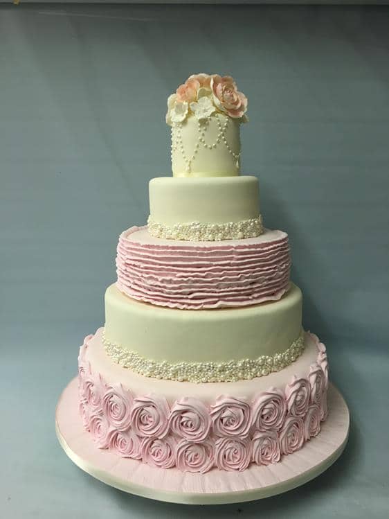 Extra large wedding cake in a sugar pink and ivory icing with hand piped ruffles and rosettes and hand piped pearls and flowers on the top