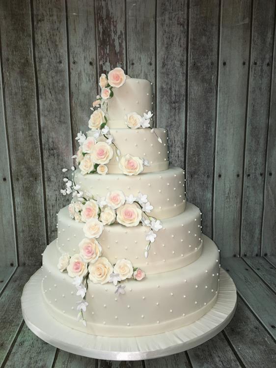 Extra large wedding cake with lace pieces all hand piped in a pearl to make it stand out that little bit more extra large roses on the corners of the centre's dusted in pink
