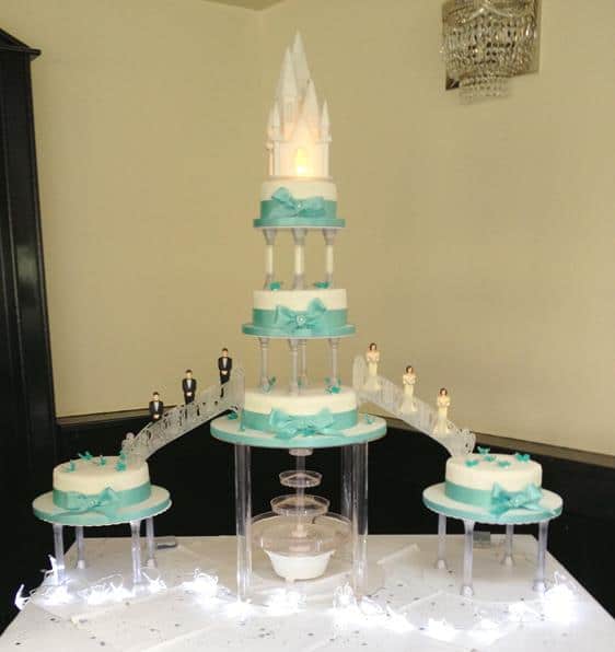 Extra large wedding cake on pillars with bridges and fountains chopped off with a Lighted church