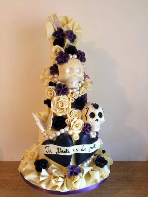 Extra large squares wedding cake in a geometric design topped off a wedding cake topper on a handmade bride and groom skiing