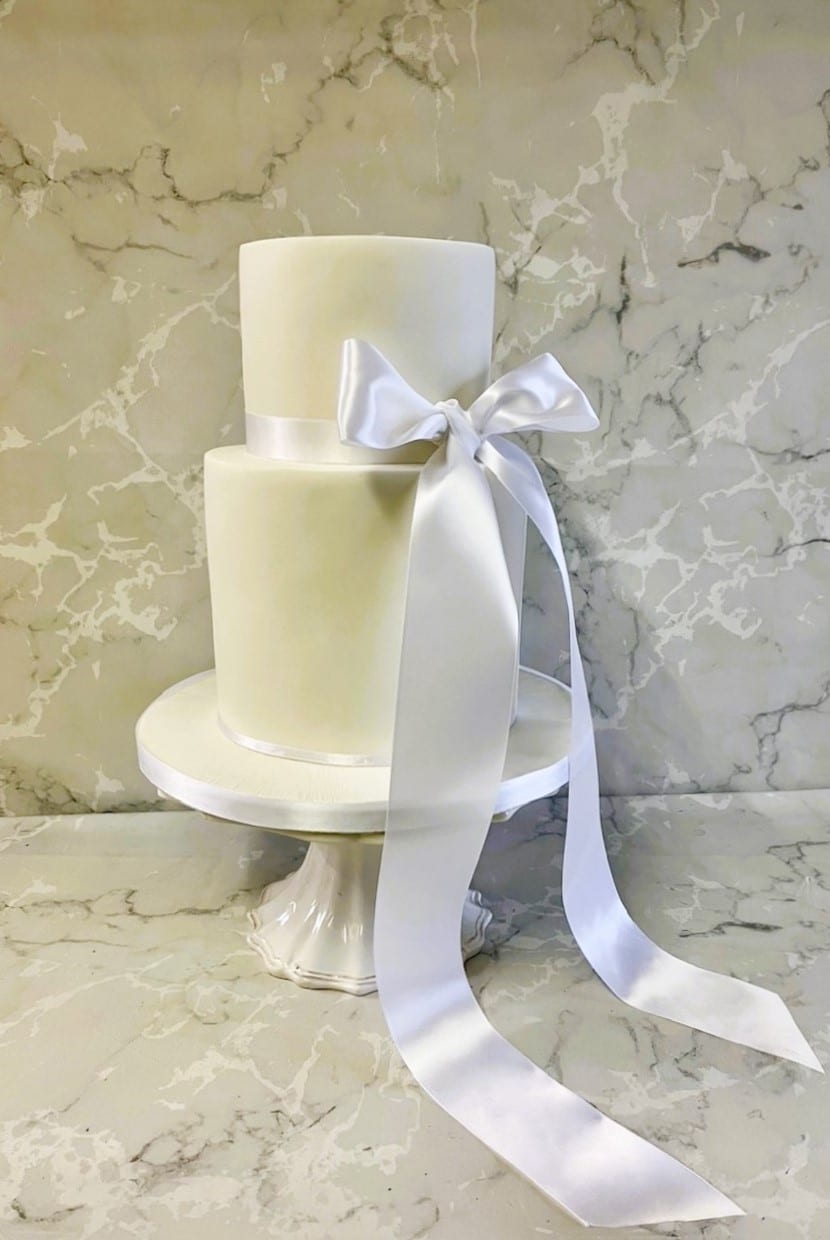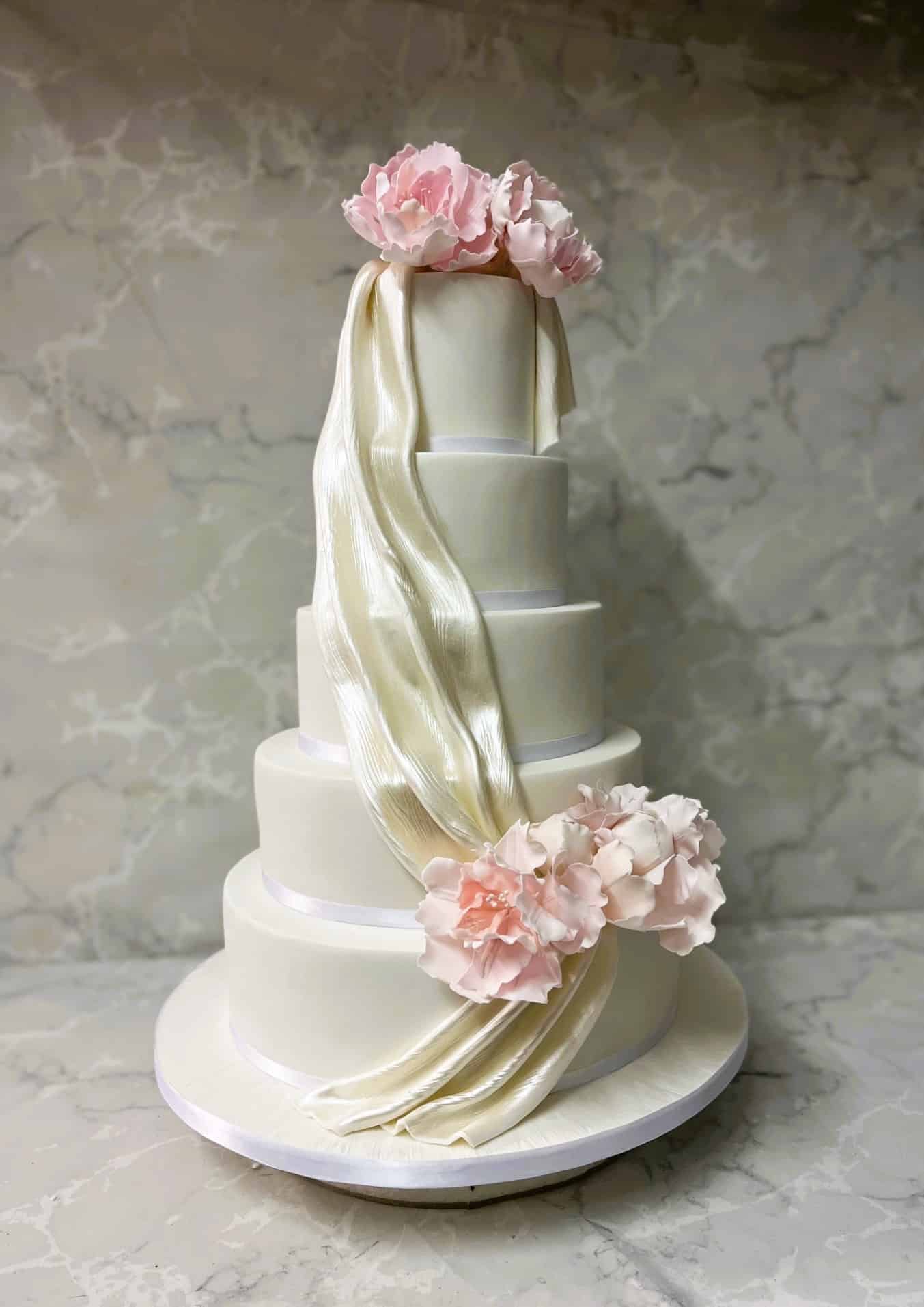 Elegant tall wedding cake with satin draping ribbon wedding cake 5-7-7'' cakes €750