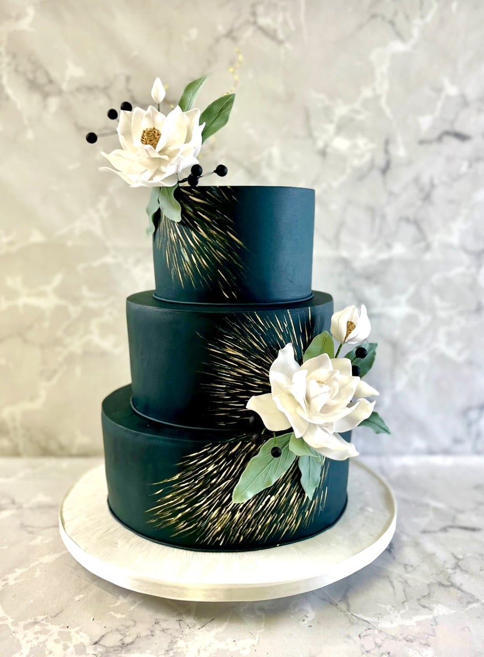 Dark green wedding cake with water Lilly's sugar flowers and hand painted gold gold 5-7-9'' cakes €790