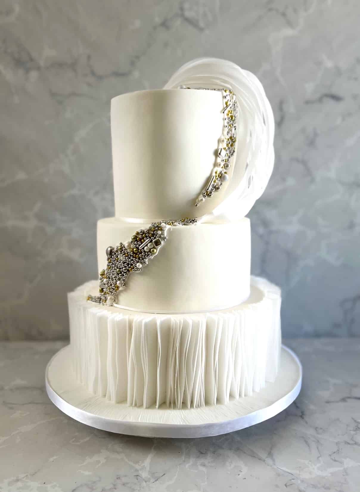 Elegant white wedding cake with wafer paper ruffles and edible pearl decoration 6-6-8-10'' cakes €750