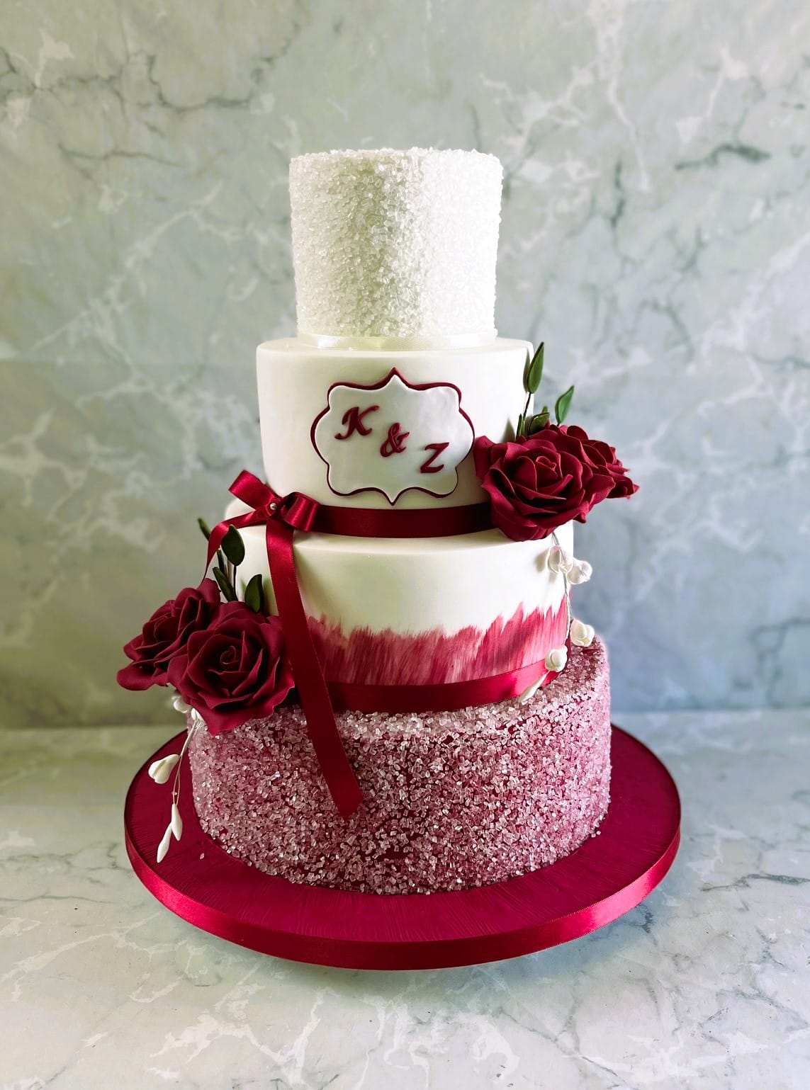Sugar crystal wedding cake in a rich wine colour with sugar flowers 4-6-8-10'' €750