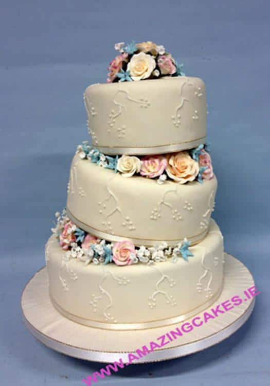 wedding cake with sashes and flowers 6-8-10" €750