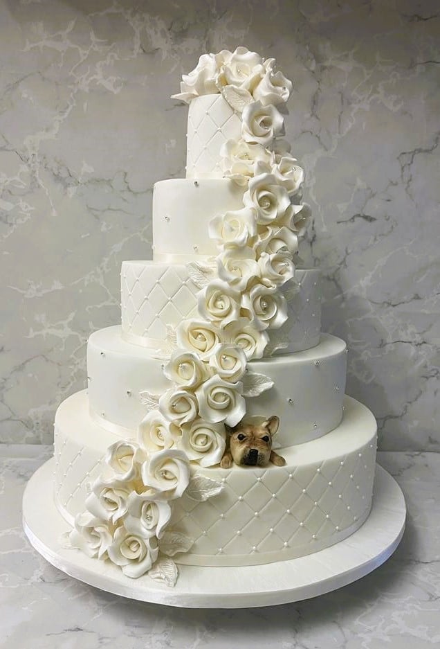 Cascading sugar roses with peeking out sugar dog 4-7-10-13'' cakes 16'' fake €990