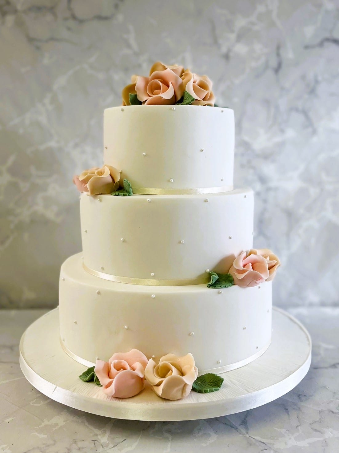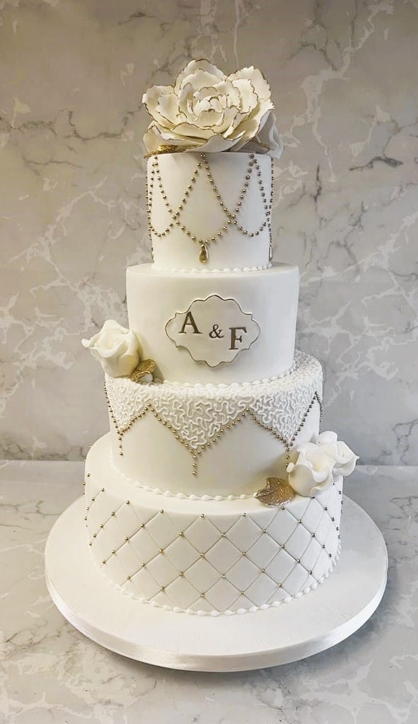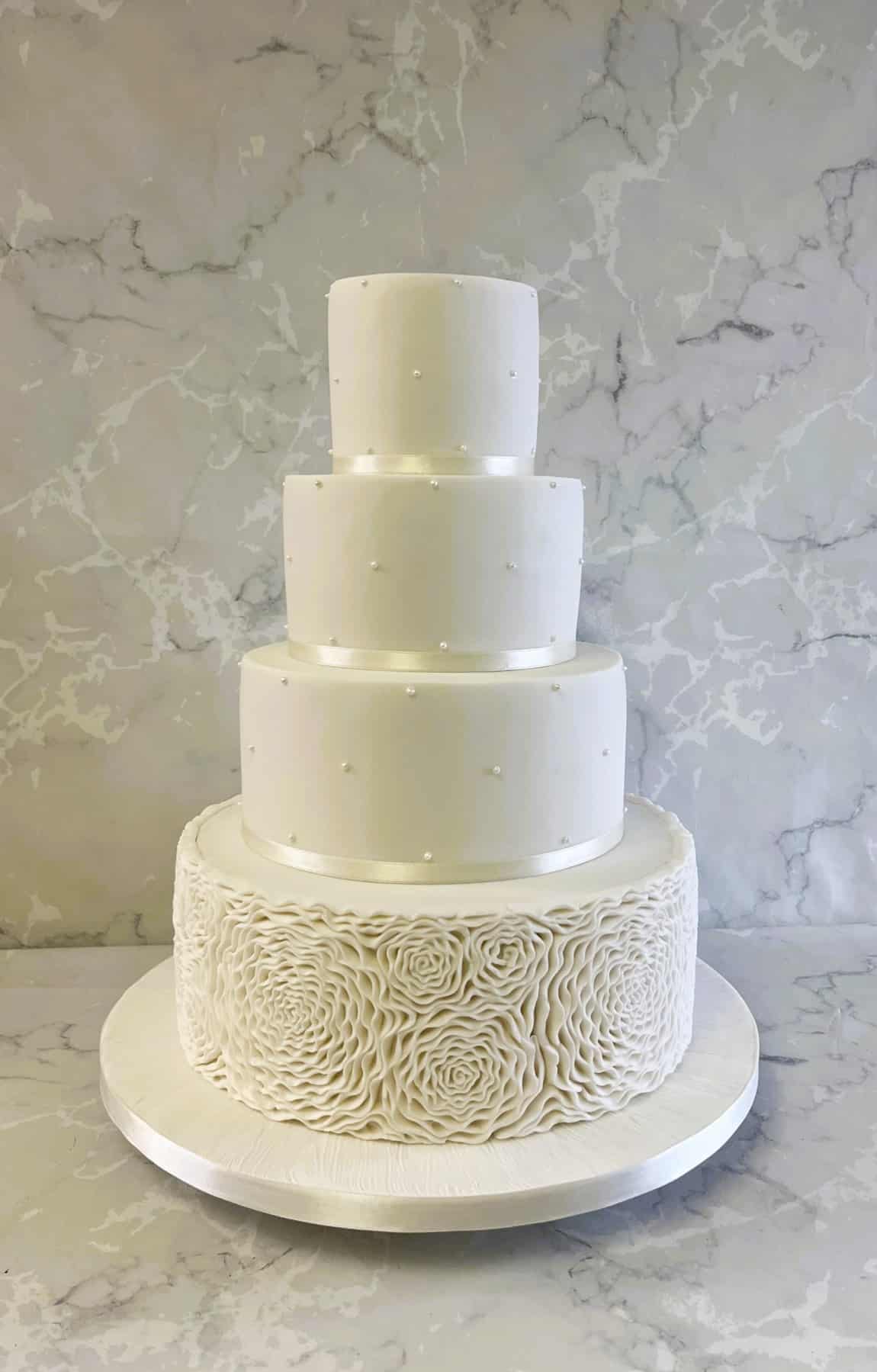 Classic white wedding cake with hand piped pearls and deep rosettes 4-6-8-10'' cakes €750