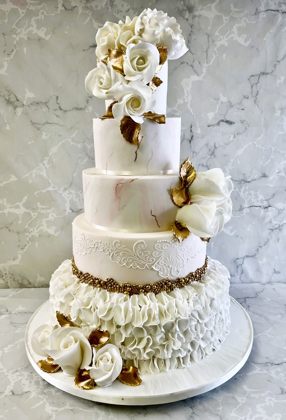Marble wedding cake with ruffles and sugar roses 4-6-8-10-12\'\' cakes €1,200