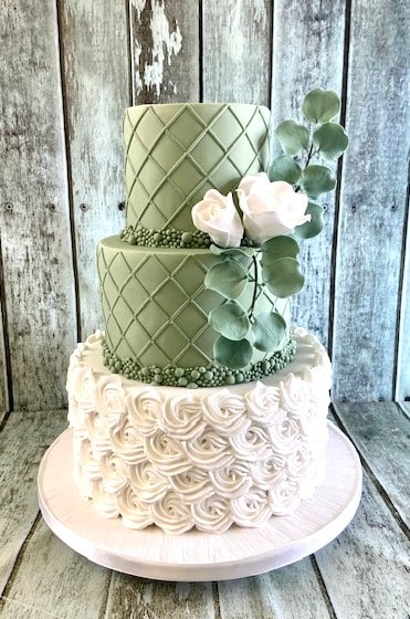Sage green Trellis and piped rosettes 6-8-10'' cakes €890