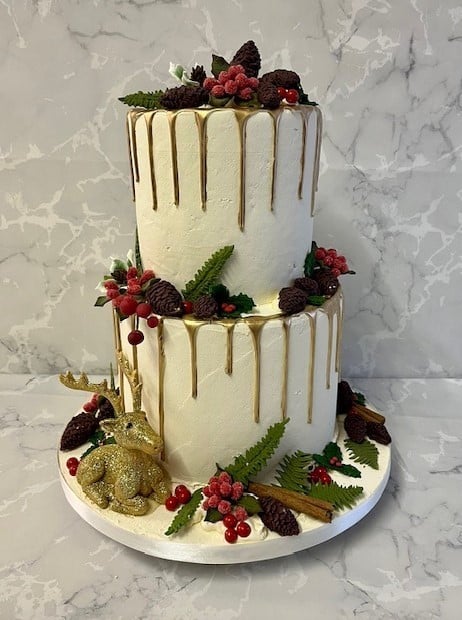 Christmas drip wedding cake with hand made fruits and reindeer cake size 6-6-8-8 ' cakes €690