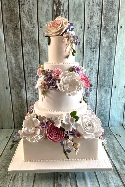 Mixed shaped wedding cake surrounded with hand made sugar flowers 4-6-8-10-12'' €1,600