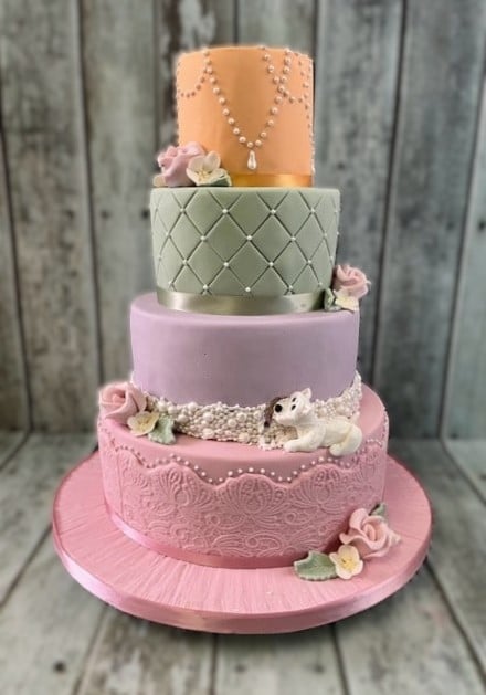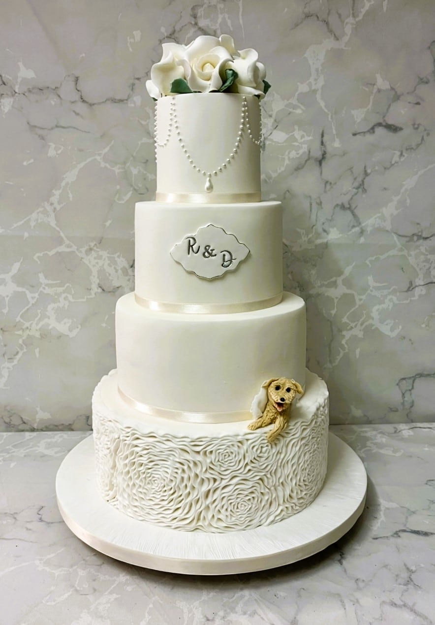 Sugar embossed Rosettes wedding cake with pearls and sugar peeping Dog 4-6-8-10" cakes €820