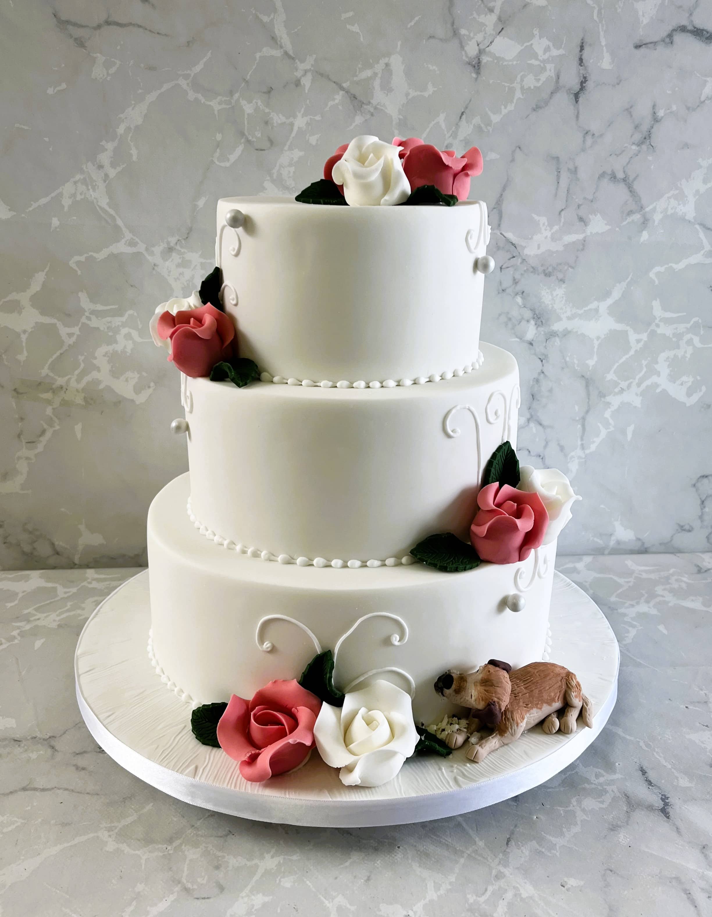 Wedding cake with sugar roses and Dog with gold leaf 6-8-10" cakes start at €785