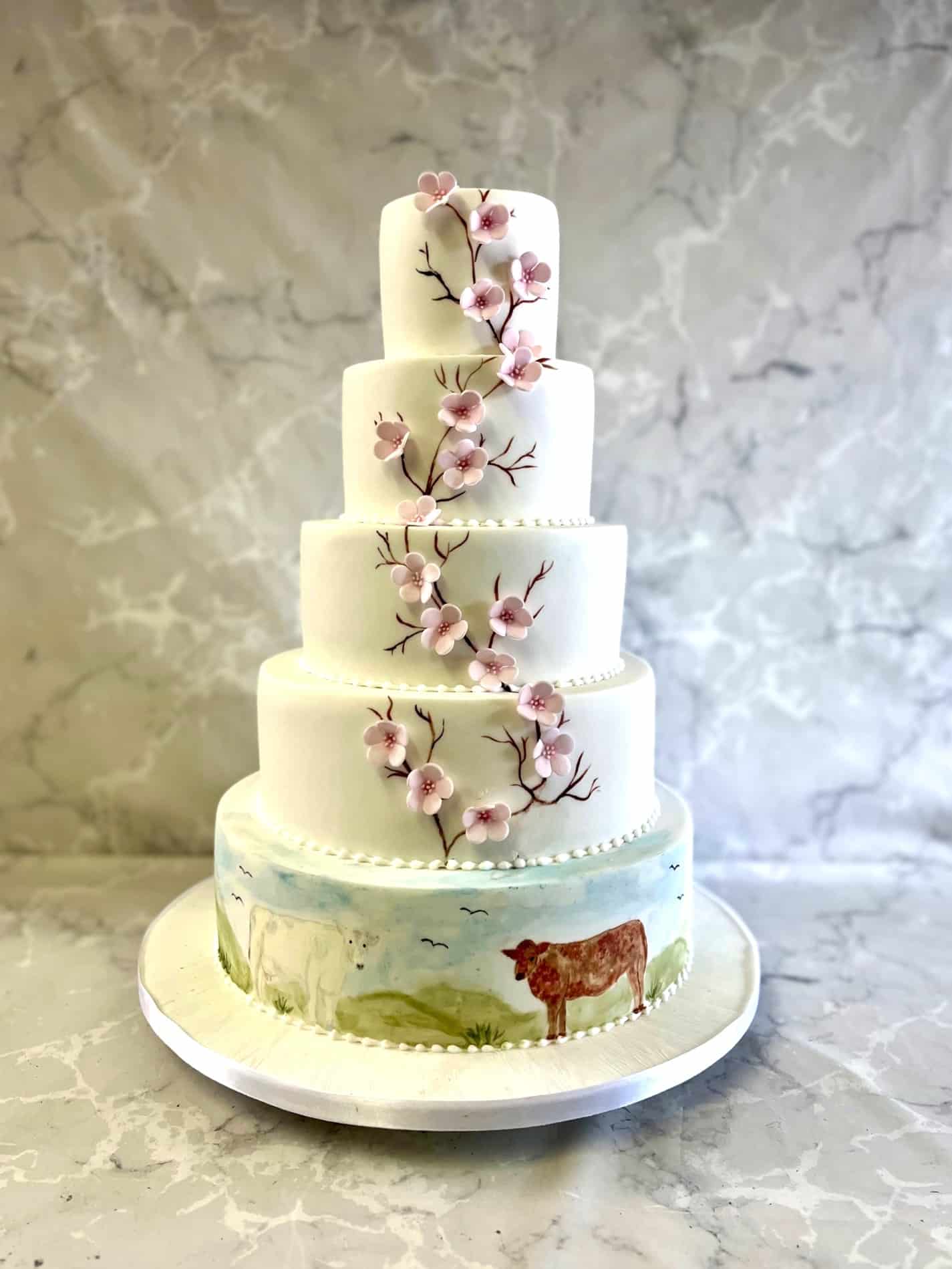 Delicate Cherry blossom wedding cake and hand painted farming scene 4-6-8-10-12'' cakes start at €1,200