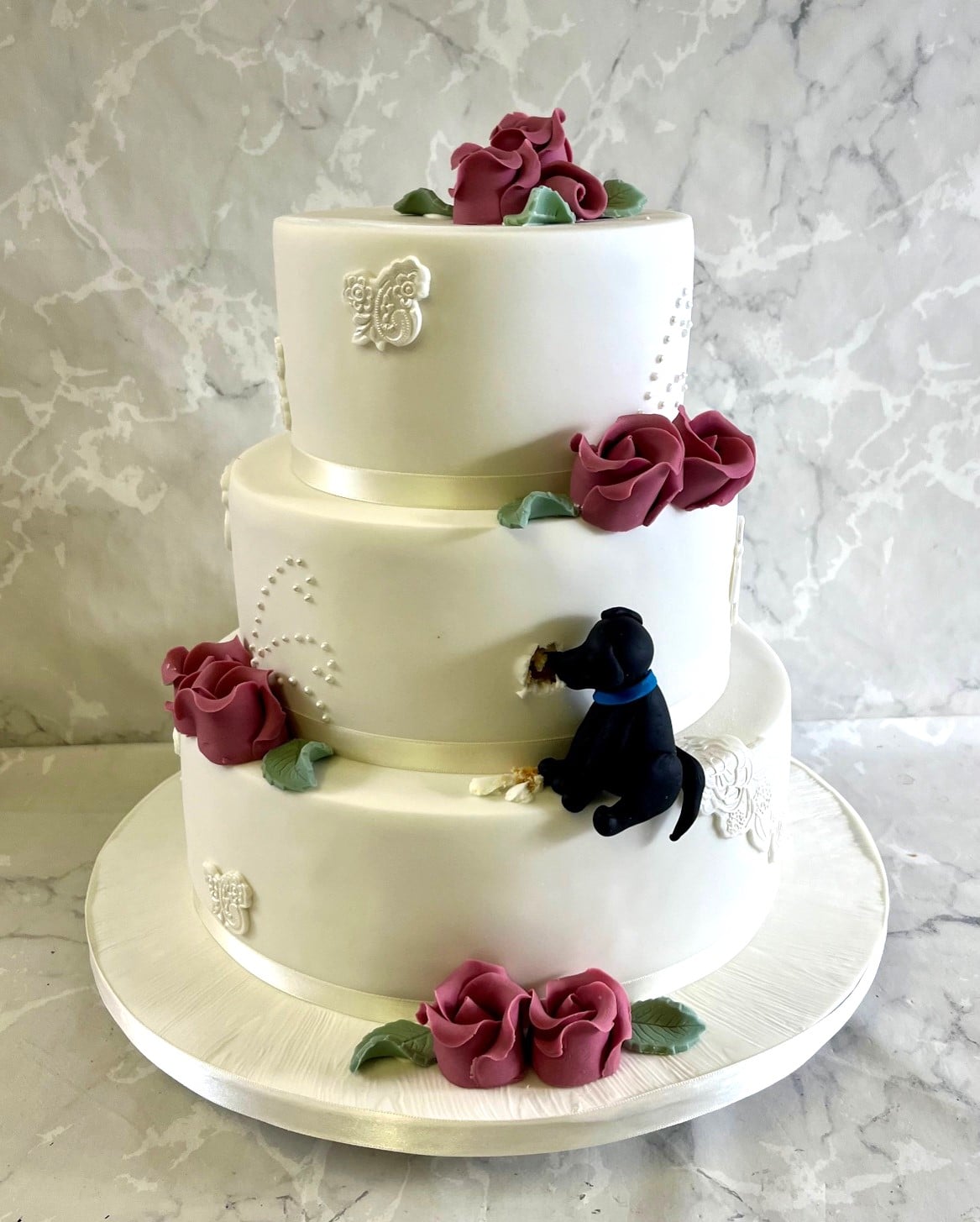 Vintage lace wedding cake with sugar dog eating into the cake 6=8-10'' cakes start at €590