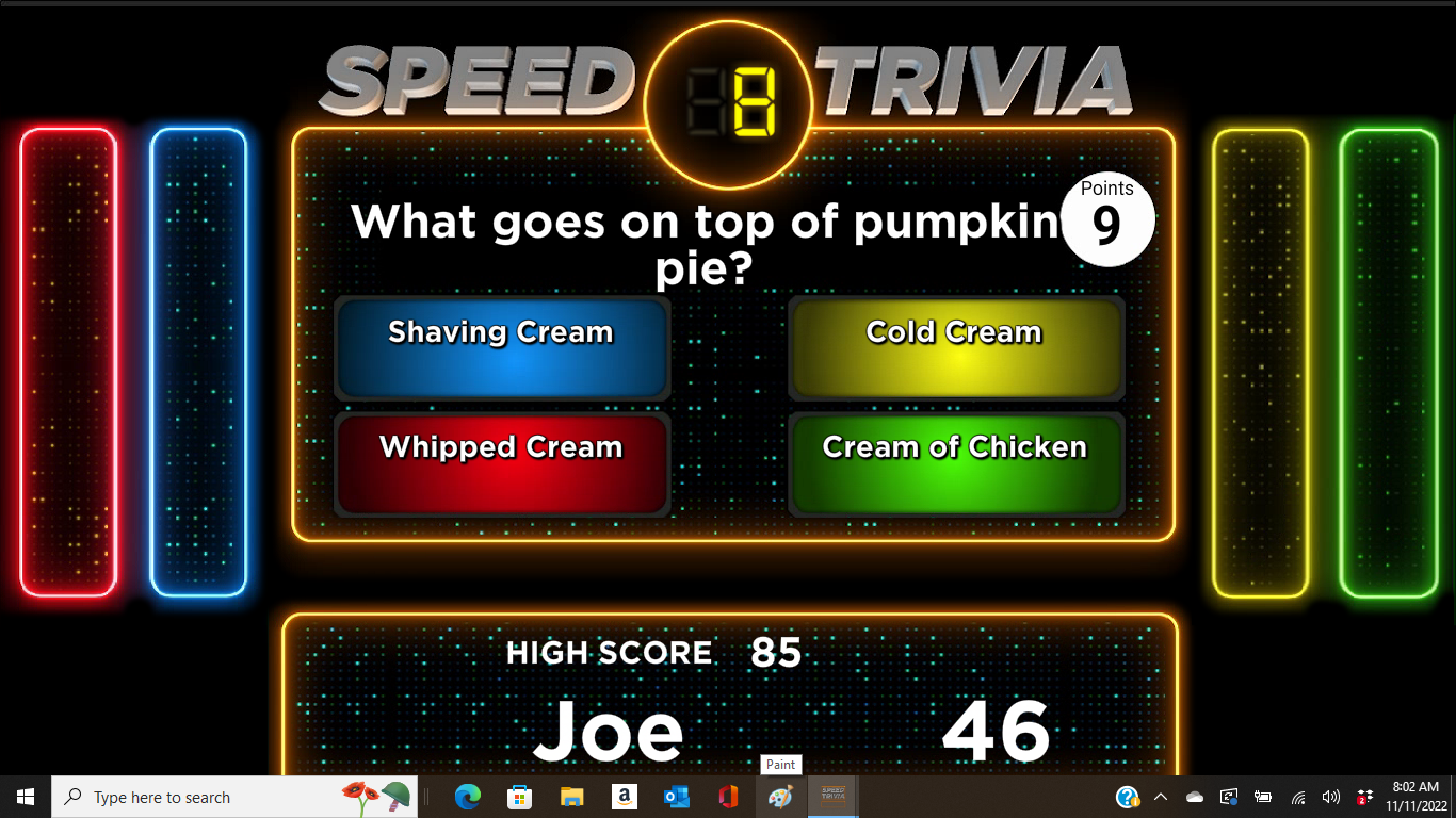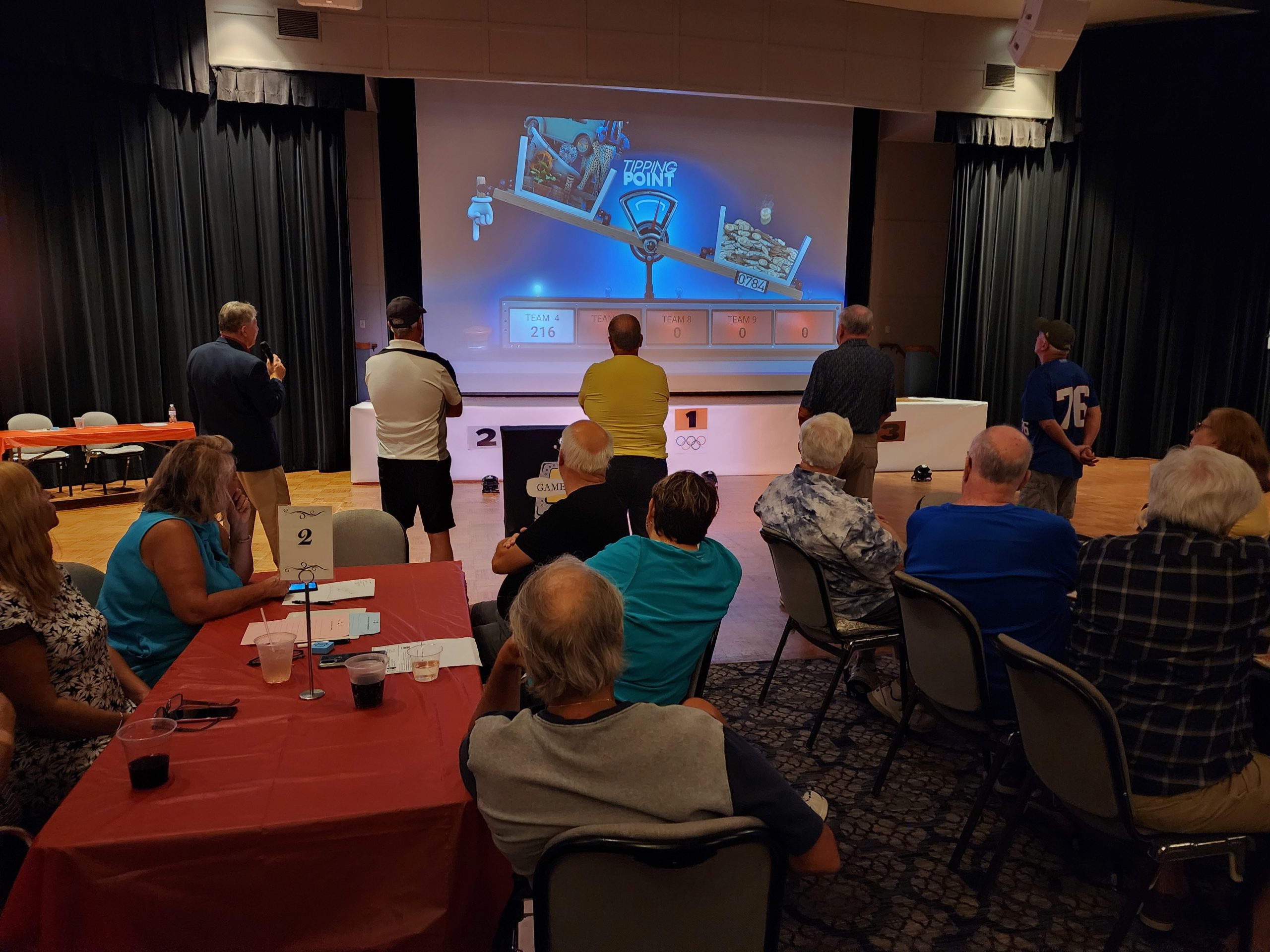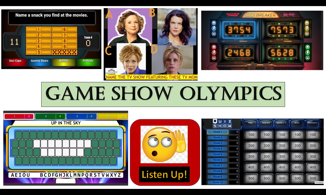 The Game Show Olympics features 6-7 mini-games inspired by classics like Match Game, Family Feud, the Price Is Right, and Wheel of Fortune. Teams earn points in each round, and the team with the most points at the end wins!