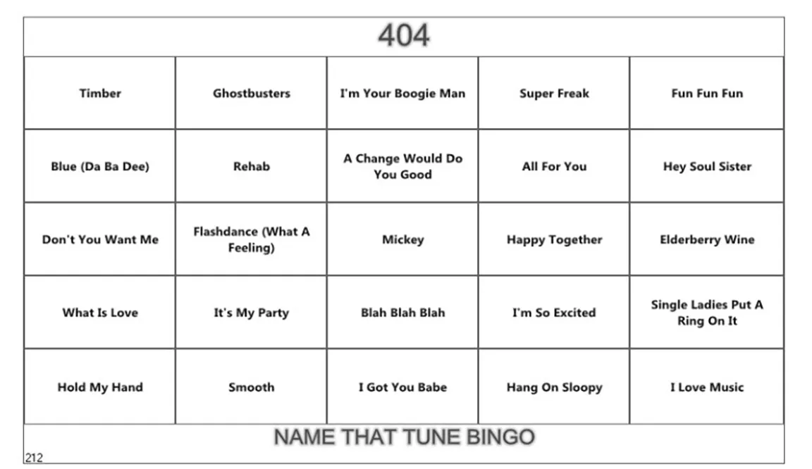 Instead of those boring bingo numbers (B-12), we’ve replaced them with bursts of sing-along songs from the 60’s, 70’s, 80’s and beyond. The bingo numbers have been replaced with song titles.